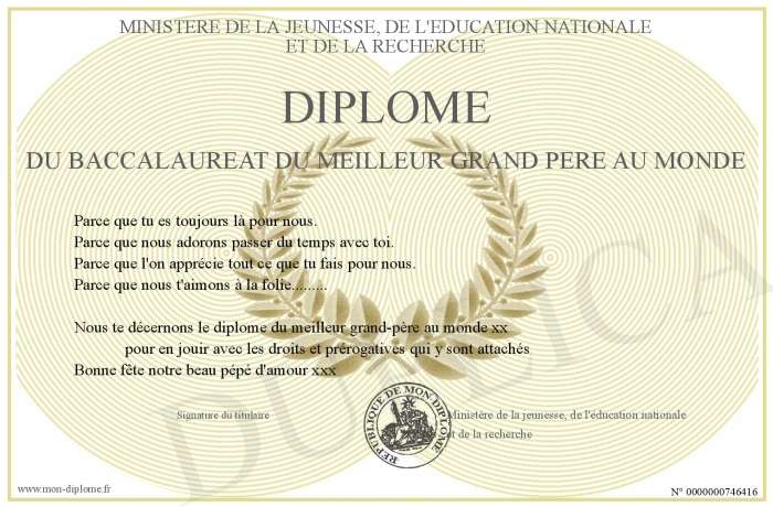 Envoyez par email votre Diplôme du baccalauréat du meilleur grand père au monde personalisé