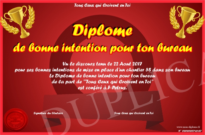 Envoyez par email votre Diplome de bonne intention pour ton bureau personalisé