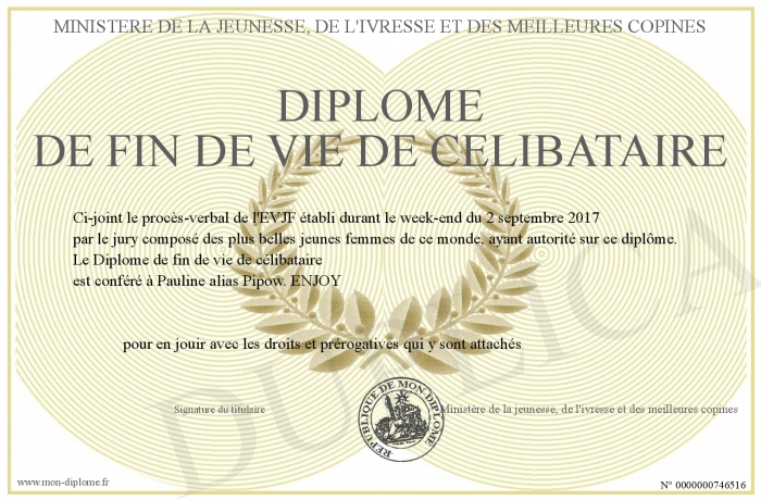 Envoyez par email votre Diplôme de fin de vie de célibataire personalisé