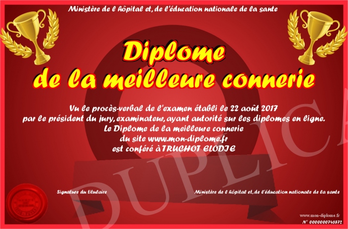 Envoyez par email votre Diplôme de la meilleure connerie personalisé