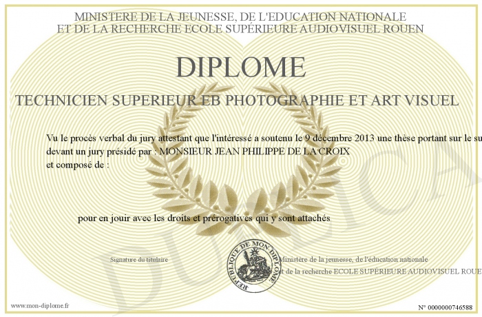 Envoyez par email votre DIPLOME TECHNICIEN SUPERIEUR EB PHOTOGRAPHIE ET ART VISUEL personalisé