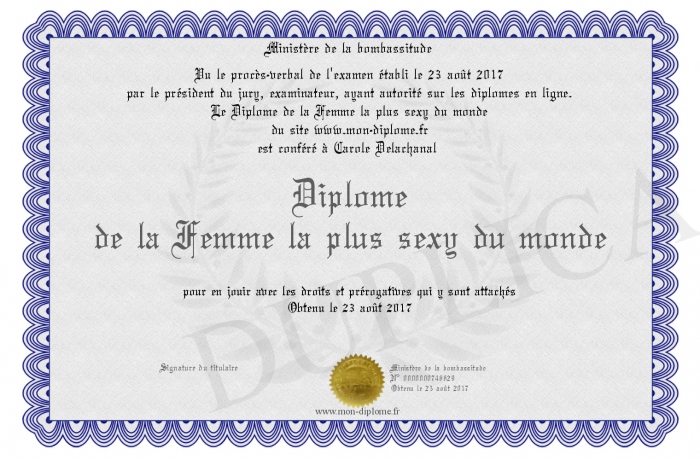 Envoyez par email votre Diplôme de la Femme la plus sexy du monde personalisé