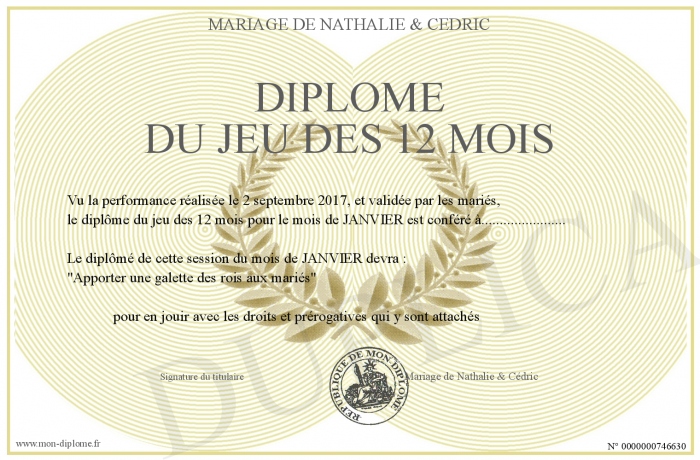 Envoyez par email votre Diplôme du jeu des 12 mois personalisé