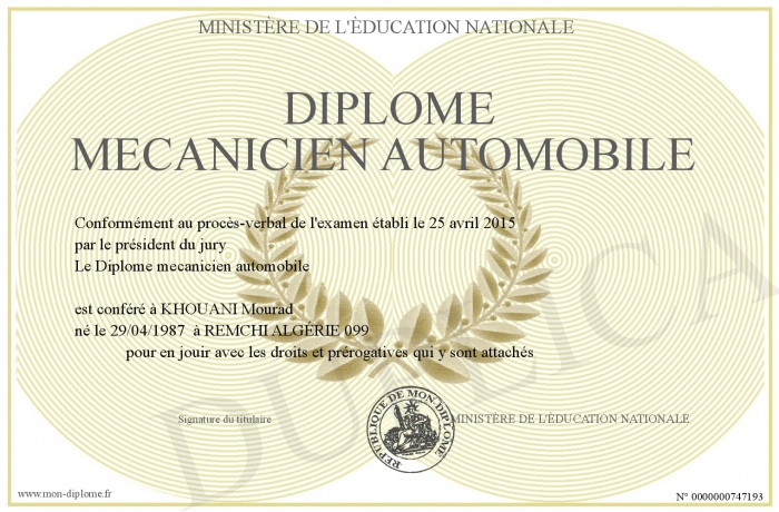 Envoyez par email votre Diplome mecanicien automobile personalisé