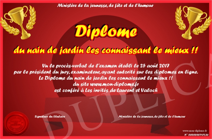Envoyez par email votre Diplôme du nain de jardin les connaissant le mieux !! personalisé