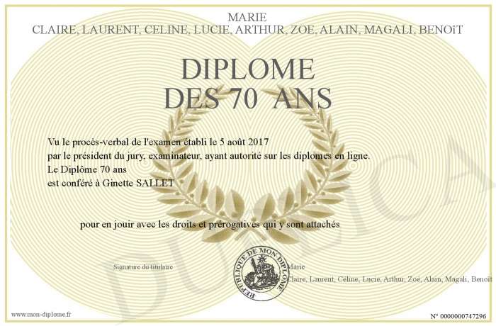 Envoyez par email votre Diplôme des 70 ans personalisé