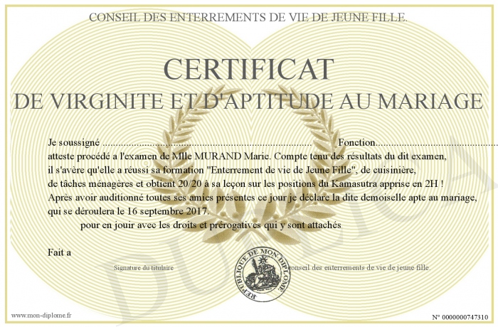 Envoyez par email votre Certificat de virginité et d'aptitude au mariage personalisé