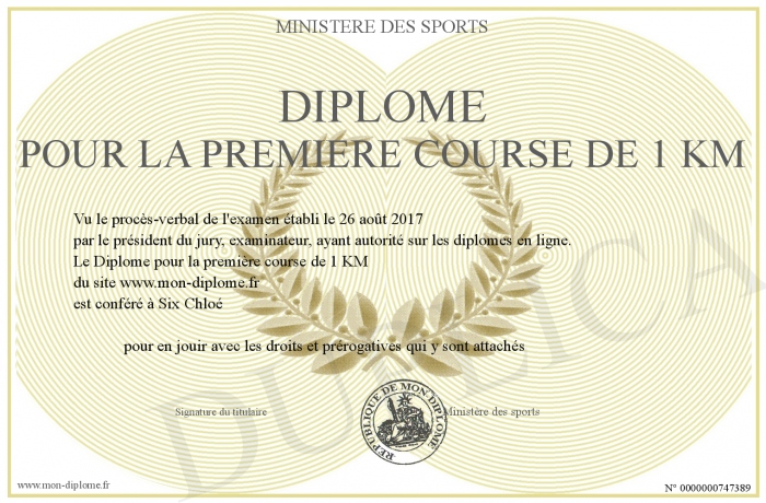 Envoyez par email votre Diplôme pour la première course de 1 KM personalisé