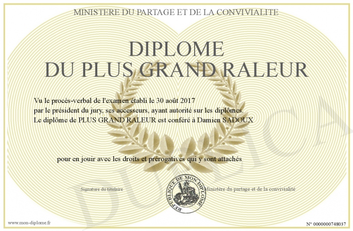 Envoyez par email votre Diplôme du plus grand raleur personalisé