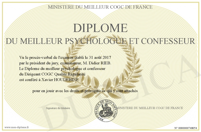 Envoyez par email votre Diplome du meilleur psychologue et confesseur personalisé