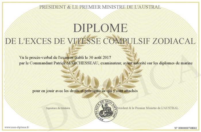 Envoyez par email votre Diplôme de l'excès de vitesse compulsif zodiacal personalisé