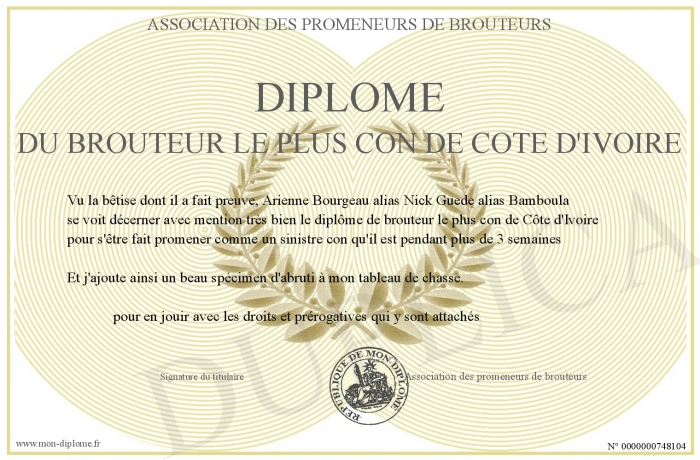 Envoyez par email votre Diplôme du brouteur le plus con de Côte d'Ivoire personalisé