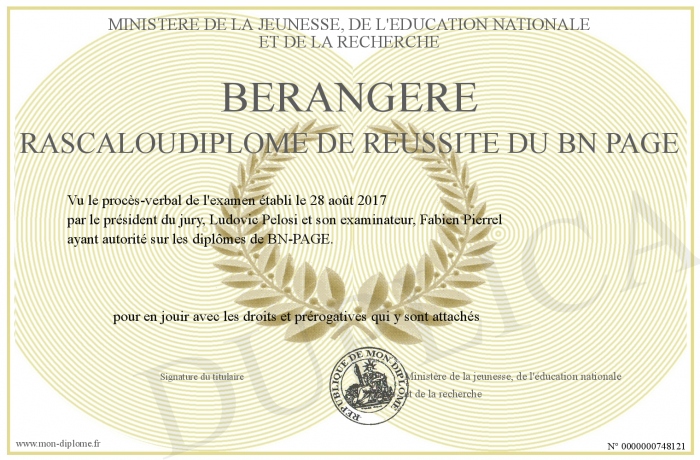 Envoyez par email votre Bérangère RascalouDiplôme de réussite du BN PAGE personalisé