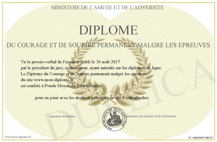 Envoyez par email votre Diplôme du Courage et de Sourire permanent malgré les epreuves personalisé
