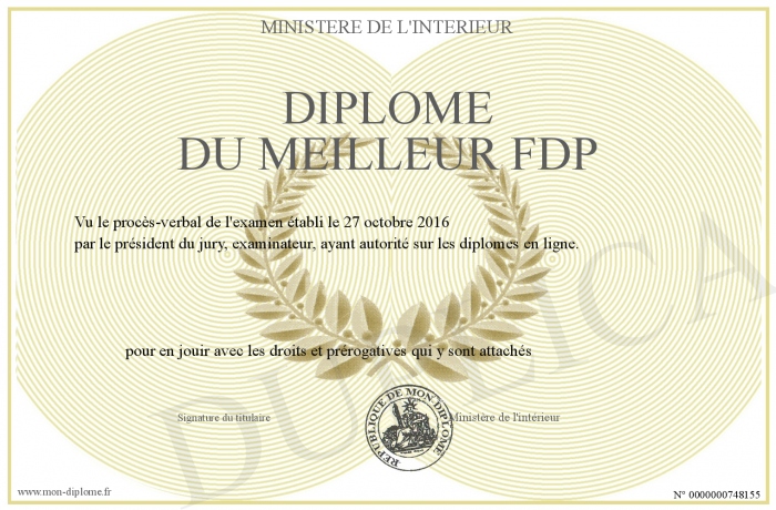Envoyez par email votre Diplôme du meilleur FDP personalisé