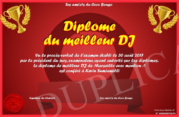 Envoyez par email votre Diplôme du meilleur DJ personalisé