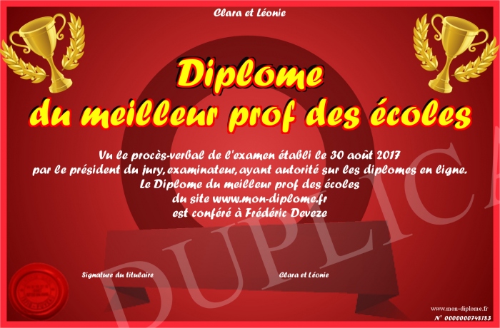 Envoyez par email votre Diplôme du meilleur prof des écoles personalisé