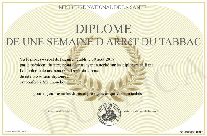 Envoyez par email votre Diplôme de une semaine d arrêt du tabbac personalisé