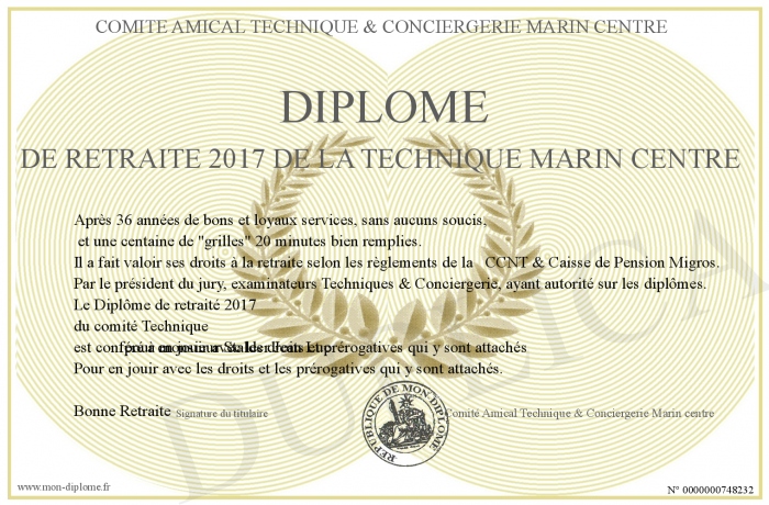 Envoyez par email votre Diplôme de retraité 2017 de la Technique Marin Centre personalisé
