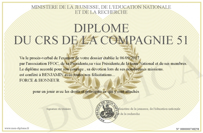 Envoyez par email votre Diplôme du crs de la compagnie 51 personalisé