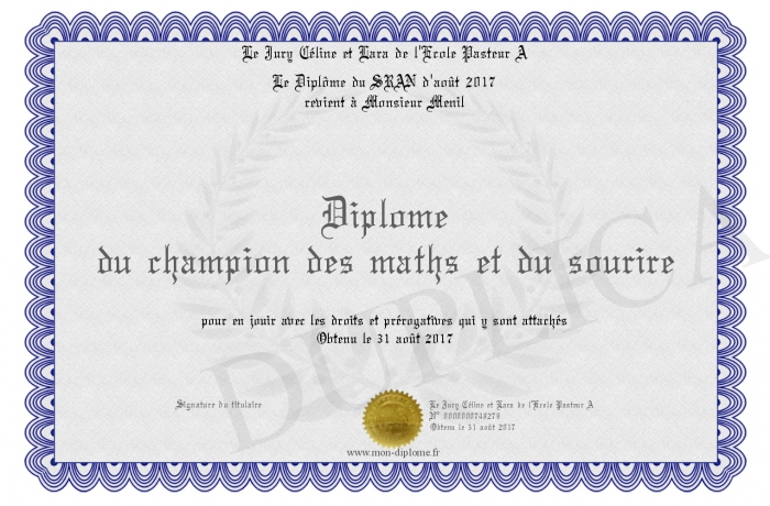 Envoyez par email votre Diplôme du champion des maths et du sourire personalisé