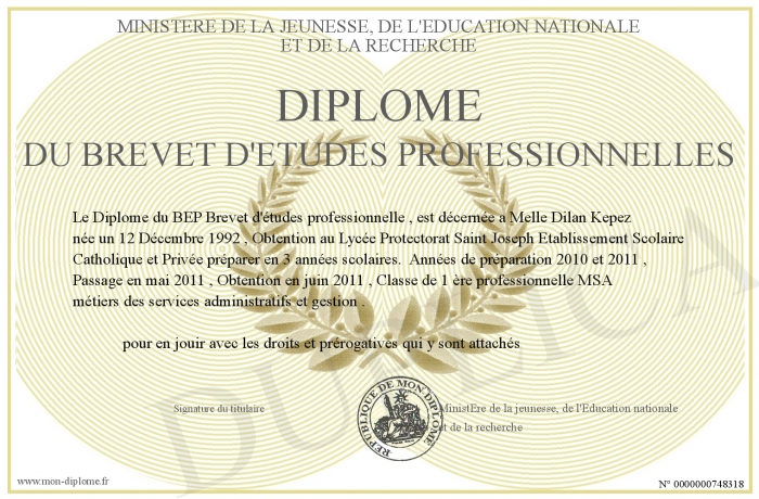 Envoyez par email votre DIPLOME DU BREVET D'ETUDES PROFESSIONNELLES personalisé