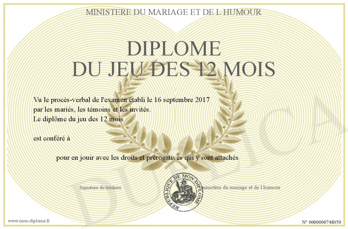 Envoyez par email votre Diplôme du jeu des 12 mois personalisé