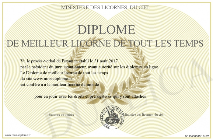 Envoyez par email votre Diplôme de meilleur licorne de tout les temps personalisé