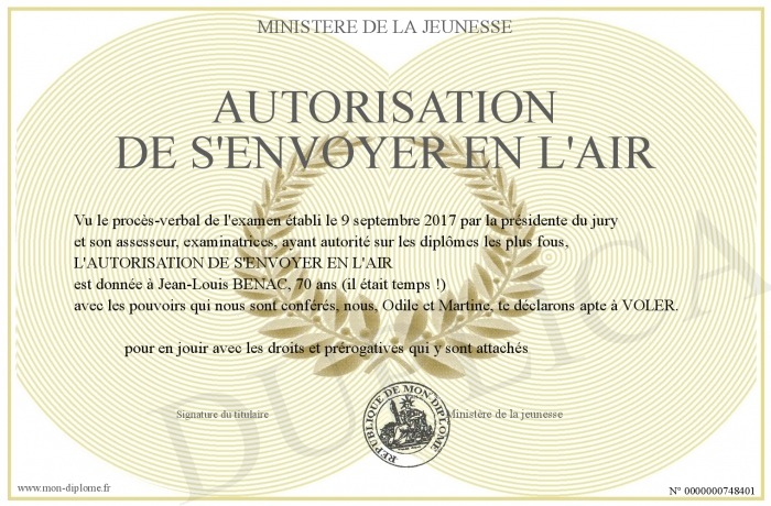 Envoyez par email votre Autorisation de s'envoyer en l'air personalisé