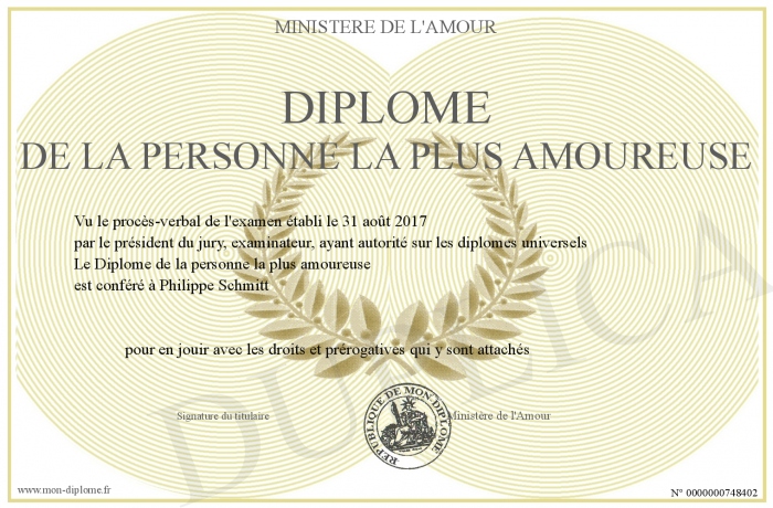 Envoyez par email votre Diplome de la personne la plus amoureuse personalisé