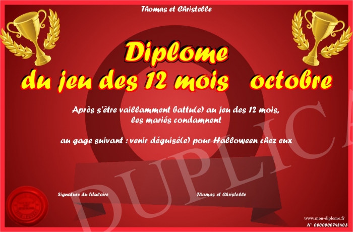 Envoyez par email votre Diplome du jeu des 12 mois octobre personalisé