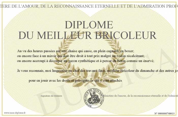 Envoyez par email votre Diplôme du Meilleur Bricoleur personalisé