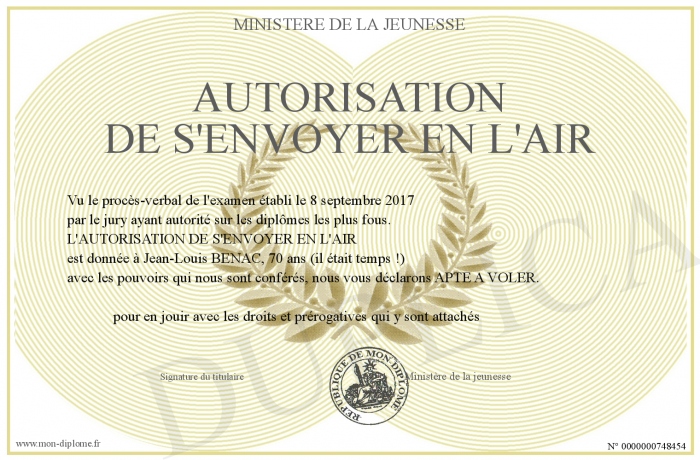 Envoyez par email votre AUTORISATION DE S'ENVOYER EN L'AIR personalisé