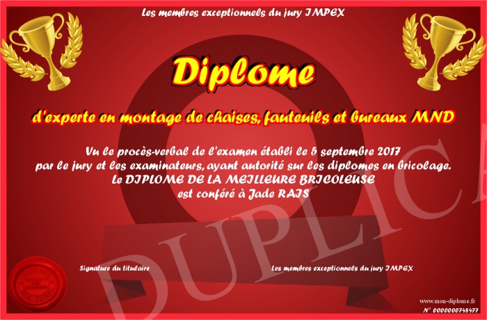Envoyez par email votre Diplôme d'experte en montage de chaises, fauteuils et bureaux MND personalisé