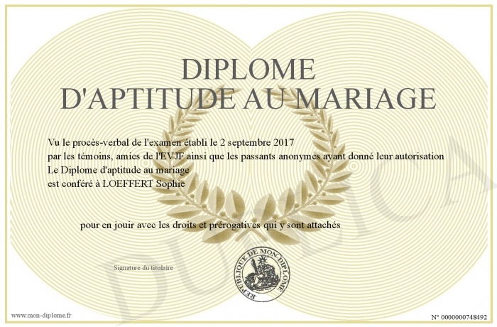 Envoyez par email votre Diplome d'aptitude au mariage personalisé
