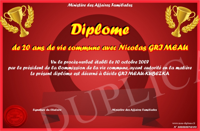 Envoyez par email votre Diplôme de 20 ans de vie commune avec Nicolas GRIMEAU personalisé
