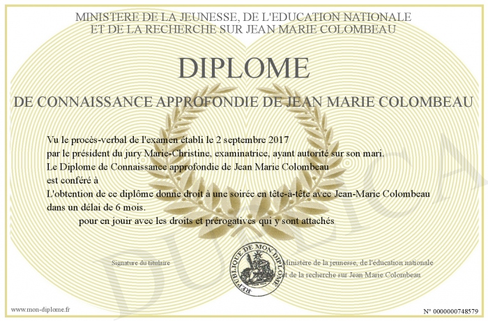 Envoyez par email votre Diplôme de Connaissance approfondie de Jean Marie Colombeau personalisé