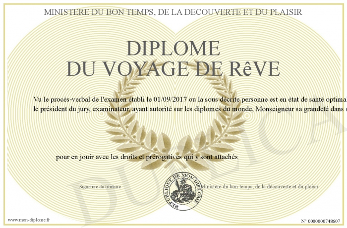 Envoyez par email votre Diplôme du voyage de rêve personalisé