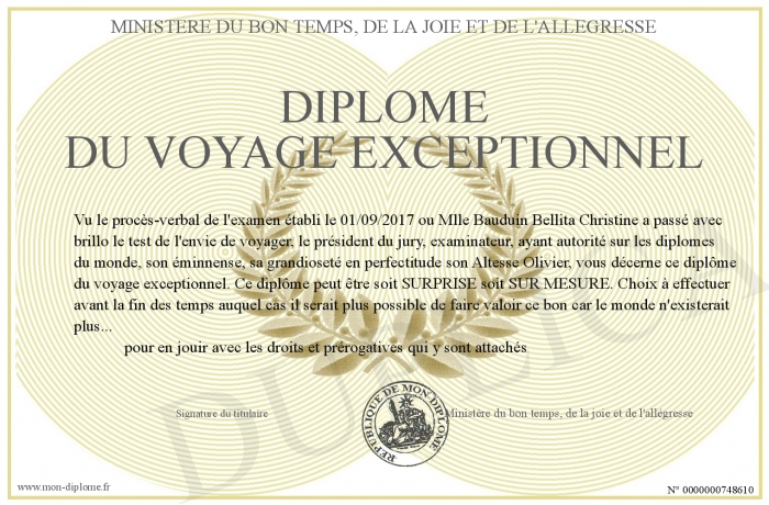 Envoyez par email votre Diplôme du voyage exceptionnel personalisé