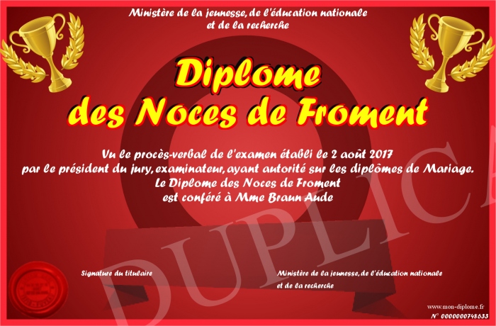 Envoyez par email votre Diplôme des Noces de Froment personalisé