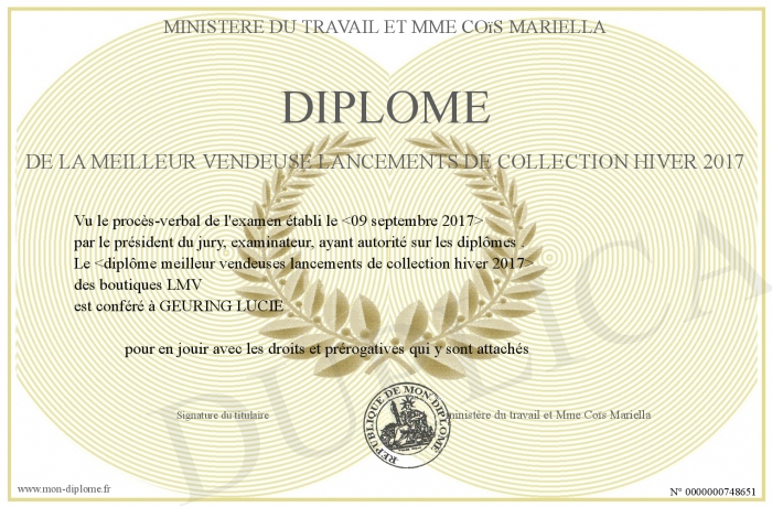 Envoyez par email votre Diplôme de la meilleur vendeuse lancements de collection hiver 2017 personalisé