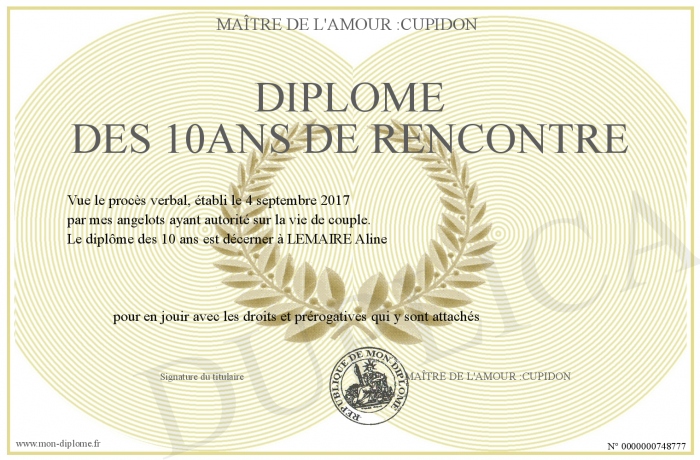 Envoyez par email votre DIPLOME DES 10ANS DE RENCONTRE personalisé