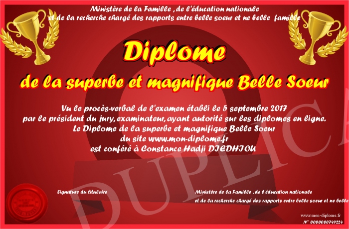 Envoyez par email votre Diplôme de la superbe et magnifique Belle Soeur personalisé