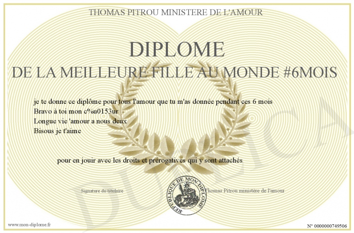 Envoyez par email votre Diplôme de la meilleure fille au monde #6mois personalisé