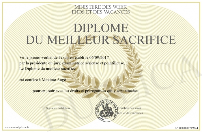 Envoyez par email votre Diplôme du meilleur sacrifice personalisé