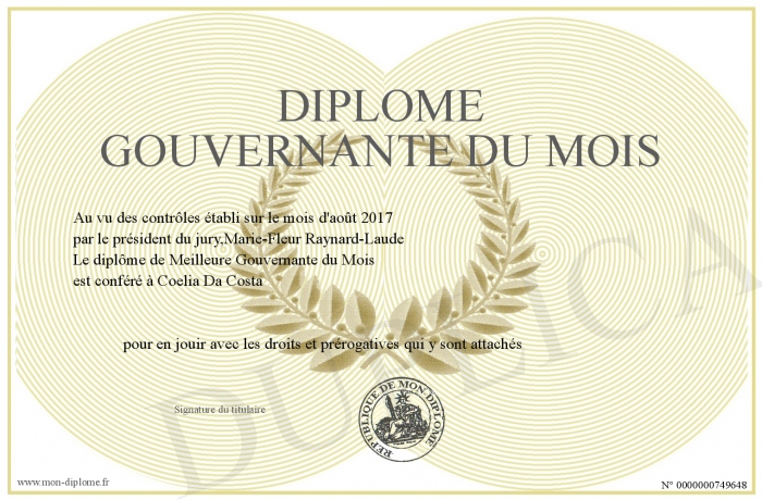 Envoyez par email votre Diplôme Gouvernante du Mois personalisé