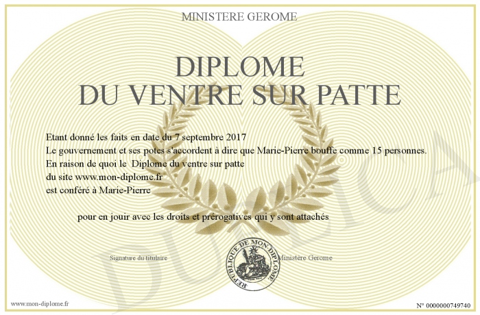 Envoyez par email votre Diplome du ventre sur patte personalisé