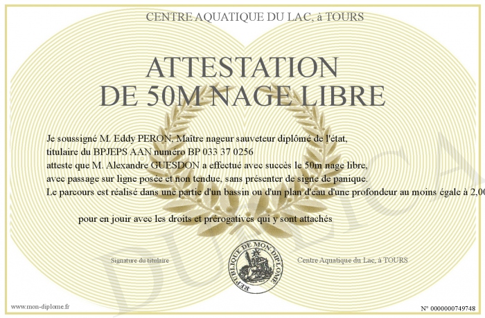 Envoyez par email votre ATTESTATION DE 50M NAGE LIBRE personalisé
