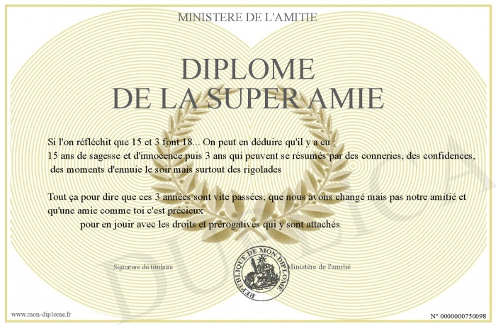 Envoyez par email votre Diplôme de la SUPER amie personalisé