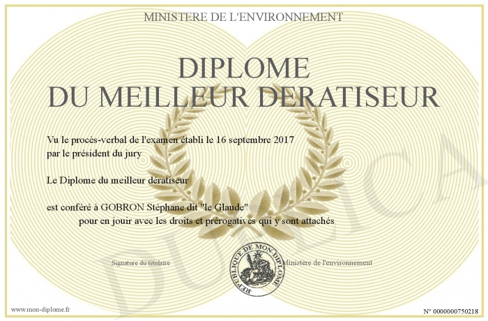Envoyez par email votre Diplôme du meilleur dératiseur personalisé